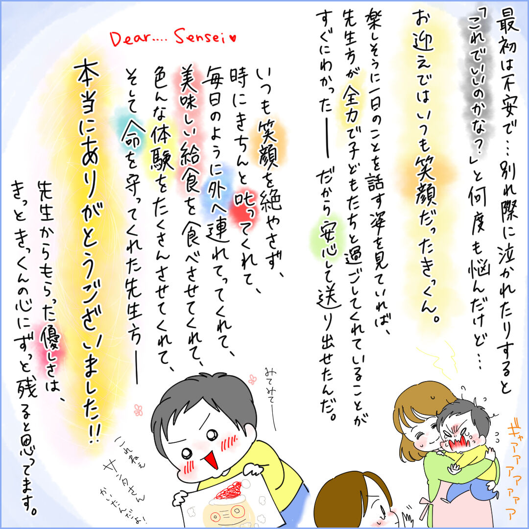 こんな状況の中でも一生懸命幼稚園、保育園を開いてくださる先生方には本当に感謝の気持ちでいっぱいです。